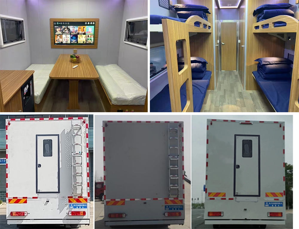備注:該車主要用于野外住宿,洗漱等野外宿營(yíng)保障,專用裝置:廂體,臥鋪; 箱體頂部封閉,不可開(kāi)啟;