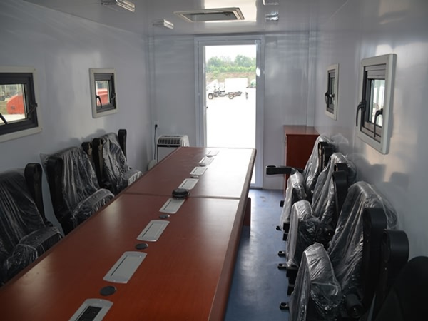 大型移動(dòng)指揮車一般會(huì)配置6部以上的無線電車載基臺,有些會(huì)多達(dá)10部以上,能夠協(xié)調(diào)眾多的單位。同時(shí)大型移動(dòng)指揮車還要安裝供車內(nèi)通話使用的通訊系統(tǒng),滿足指揮車內(nèi)部各個(gè)功能區(qū)的聯(lián)絡(luò)需要。 多數(shù)移動(dòng)指揮車還會(huì)安裝多部地面線路通訊交換機(jī)和無線通訊車載基站,既可以連接現(xiàn)有有線通信線路,也可以搭建臨時(shí)的無線通信網(wǎng)絡(luò),保證指揮部門多線路的通信需求。尤其是面對互聯(lián)網(wǎng)應(yīng)用的發(fā)展,移動(dòng)指揮車還要搭載移動(dòng)寬帶網(wǎng)絡(luò)服務(wù)設(shè)備。因此一臺大型移動(dòng)指揮車就是一臺應(yīng)急通信車。這在通信不暢的山區(qū)荒野和自然災(zāi)害現(xiàn)場,具有重要意義。通常的大型移動(dòng)指揮車都將指揮設(shè)置在車體后部,同時(shí)兼做會(huì)議室的功能,下圖就是面向車體后部的車內(nèi)視圖,對于一些外形尺寸受限的中型移動(dòng)指揮車而言,在通訊聯(lián)絡(luò)區(qū)域之后,一般是如下圖中間位置那樣設(shè)置一個(gè)建議的休息空間用作會(huì)議室,那些大型移動(dòng)車則要在類似的位置安裝更多新奇的裝備。